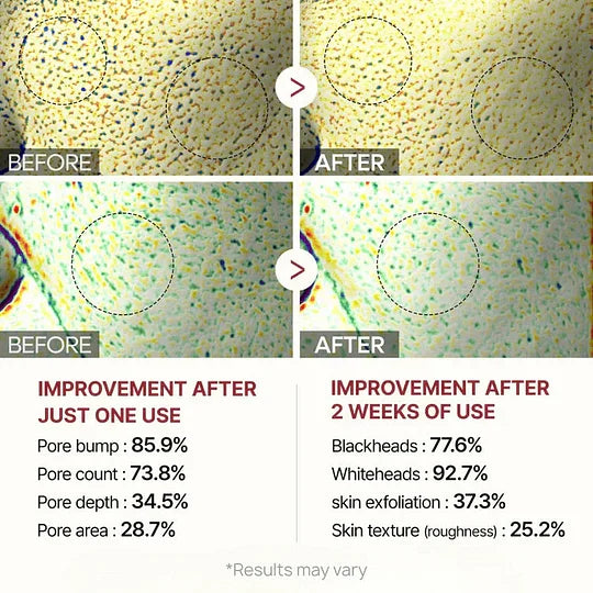PENTA-RICE (Rice Water Extract + PENTAVITIN) : A unique blend that softens and removes dead skin cells while controlling excess sebum, providing instant hydration for a complete skincare feel after exfoliation.
